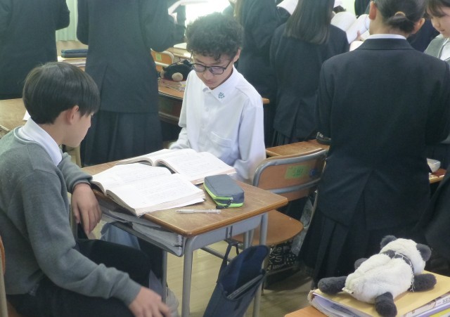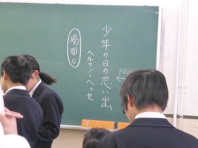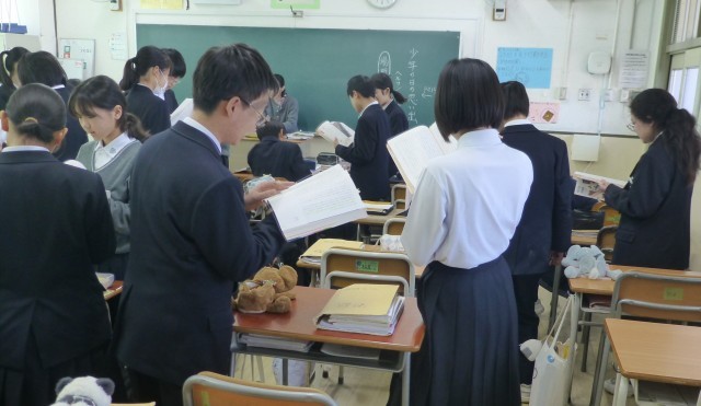 「少年の日の思い出」をペアになって交代で音読しています。