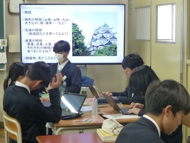 グループごとに各地方を担当し、地形、気候、産業などの特徴や各地方の特産物や見どころなどをまとめています。