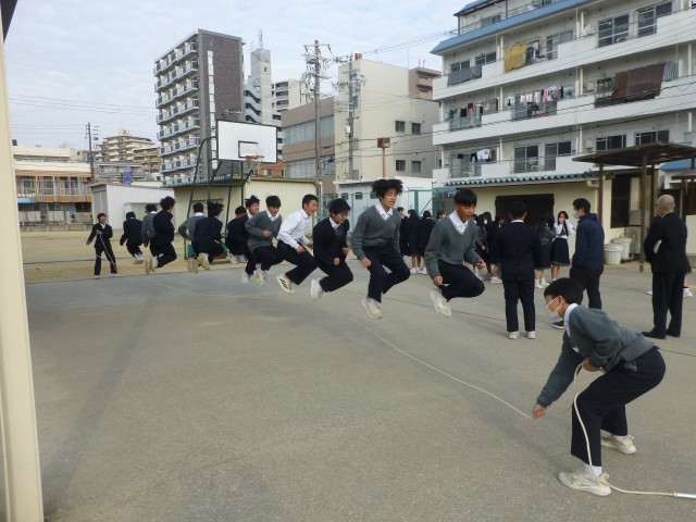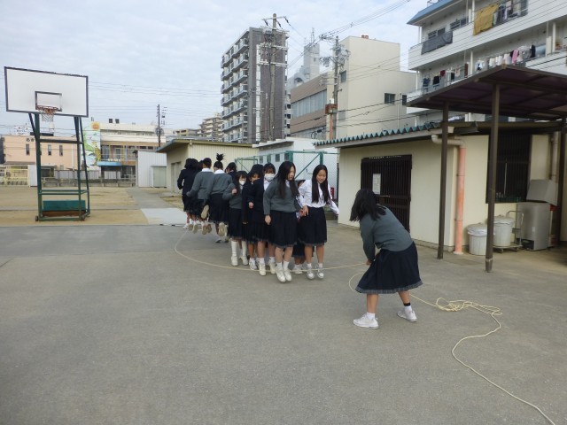 「度数分布表」を作るデータ採集のため、長縄とびをしています。