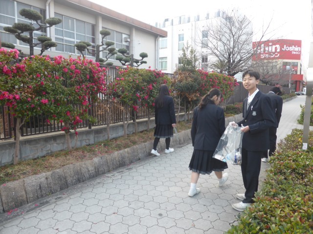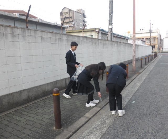 毎週火曜日の朝に、生徒会の呼びかけで、ボランティアの生徒たちが学校周りの清掃活動をしています。