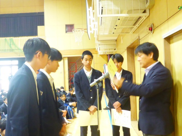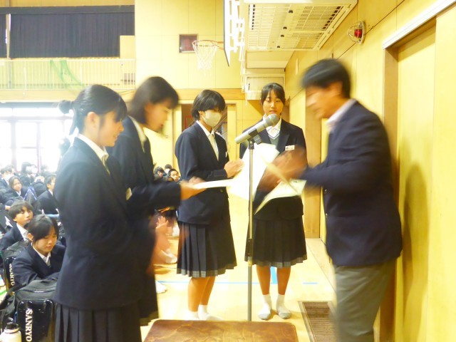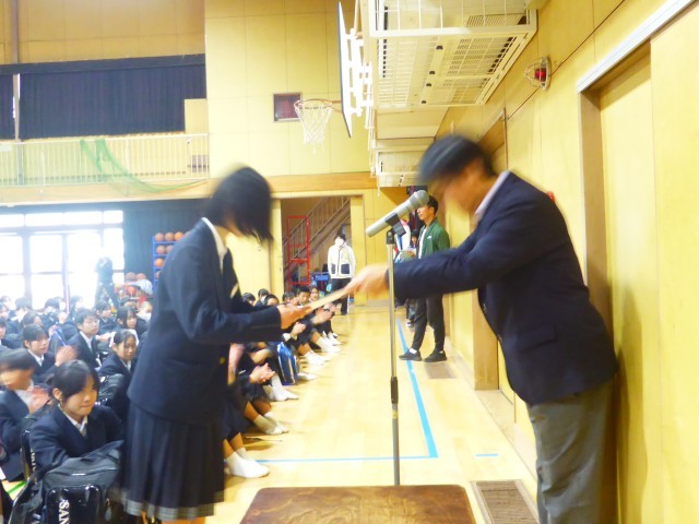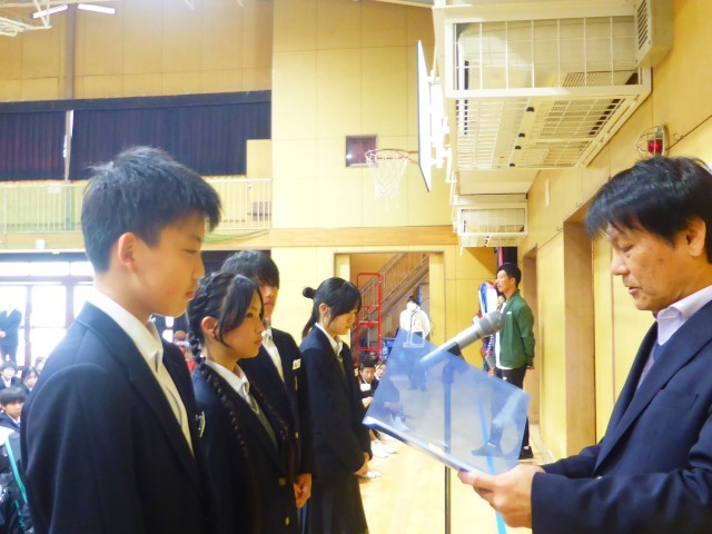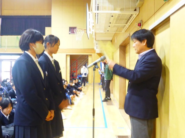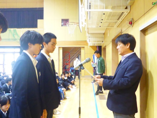 まずはじめに、ソフトテニス部、バドミントン部に表彰状の伝達をおこないました。