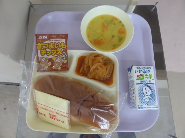 今日の給食のメニューは、煮こみハンバーグ コーンスープ おさつチップス スライスチーズ(乳) です。