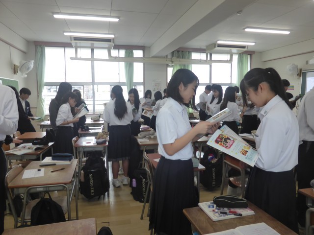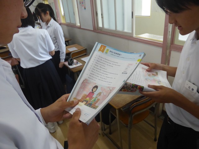 教科書の「きれいなお弁当!」という本文をペアで朗読しています。