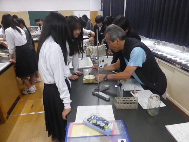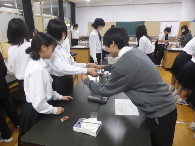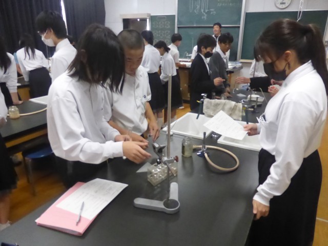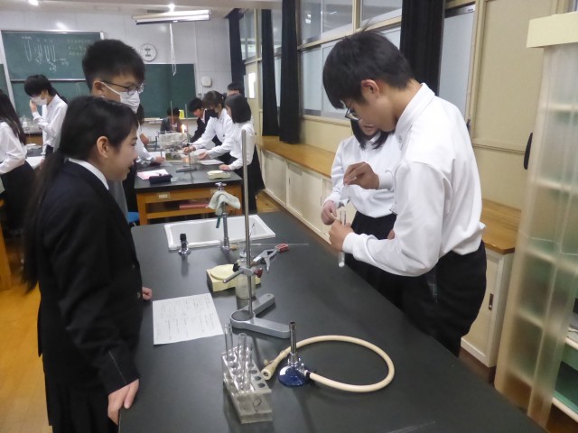 理科室で「重曹(炭酸水素ナトリウム)」の熱分解の実験をしています。