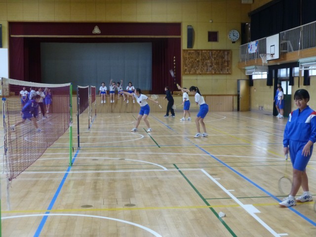 3時間目、3年3,4組は体育です。女子はバドミントンで試合をしています。先生も入...
