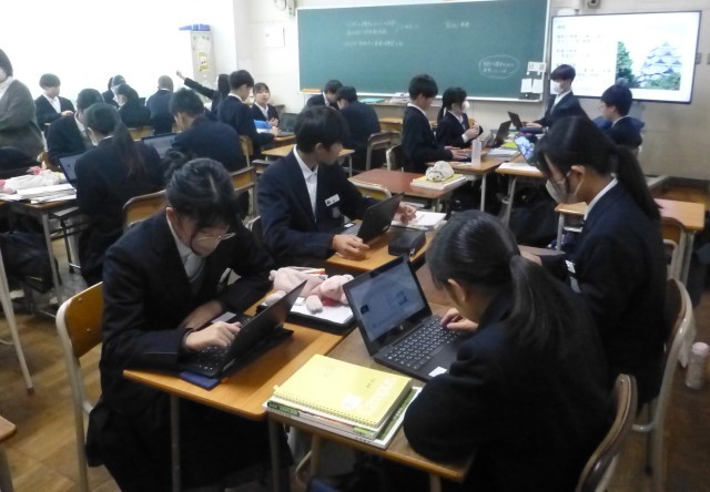 4時間目、2年1組は社会です。日本の各地方を紹介するプレゼンの資料を作製していま...