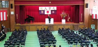 真新しい制服に身を包んだ新1年生(75期生)は胸を張って入場し、ぴんと姿勢を正してしっかりと祝辞を聞いていました。