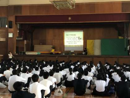 はじめに我孫子中学校の歴史についてスライドを見ながら確認した後、あび中OGである西垣先生からのお話を聞きました。