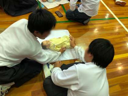 妊婦体験では8kgの妊婦ジャケットを着用して、靴下を脱いだり履いたりや床にあるボールペンを取ったり思い荷物を運ぶ体験をしました。赤ちゃんの抱っこ体験では、ドキドキしながら人形を抱っこする姿が見られました。