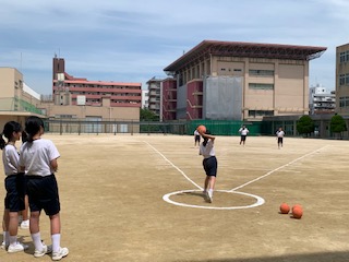 2年生の女子は昨日、体力テストのハンドボール投げをしました。