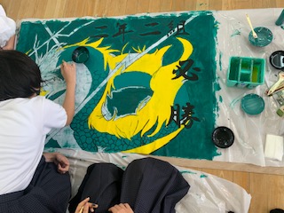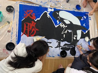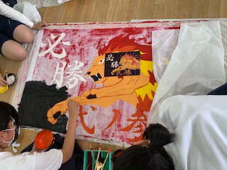 懇談期間を利用して体育大会の学級旗づくりをしています。各クラスで選ばれたデザインを協力して作成しています。どのクラスもダイナミックで学級の雰囲気が出ています。