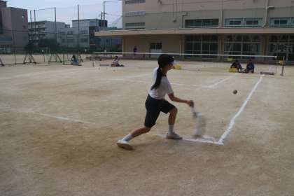 私たちソフトテニス部は1年生8人、2年生19人、3年生10人で活動しています。部員のほとんどは初心者で、試合に勝つため日々の練習を頑張っています。平日は、1面のコートで基本練習を中中心にしています。休日は二部制で、校内試合をしたりしています。
