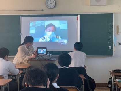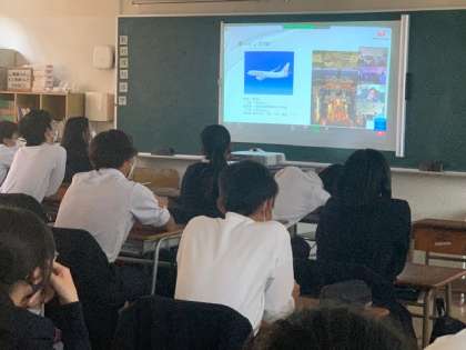 本日は職業講話として、日本航空(JAL)の運航乗務員(副操縦士)の方のお話をお伺いすることができました。業務の内容はもちろん、様々な職種の方との「最高のバトンタッチ」を合言葉に相手を思いやって協力して仕事をしていることをお話いただきました。これは中学生の皆さんにもできる小さな心遣いだともおっしゃっていただきました。