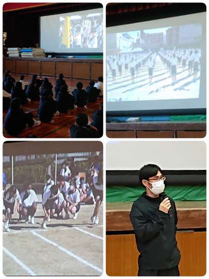 体育大会のビデオを視聴しました。学年主任の竹中先生より、歩んできたことを節目で振り返ることは大切で、今日の映像を見て日頃の学校生活にどのようにつなげていくかが大事であるとのお話をしていただきました。