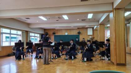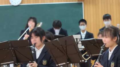26日、卒業した3年生も参加して、ミニコンサートが行われました。迫力いっぱいの演奏から、3年生に送る演奏まで、素敵な音が広がりました。
