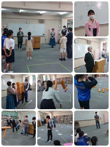 我孫子中学校において、我孫子地区の韓国・朝鮮にルーツをもつ児童生徒が集い交流を深めました。写真は、ユンノリ(朝鮮半島に伝わる双六のような遊戯)をしている様子です。