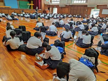 大きなカバンの荷物を確認しました。明日は各自のリュックサックかサブバッグに弁当・水筒や体操服の予備などを入れて7:55までに登校して下さい。
