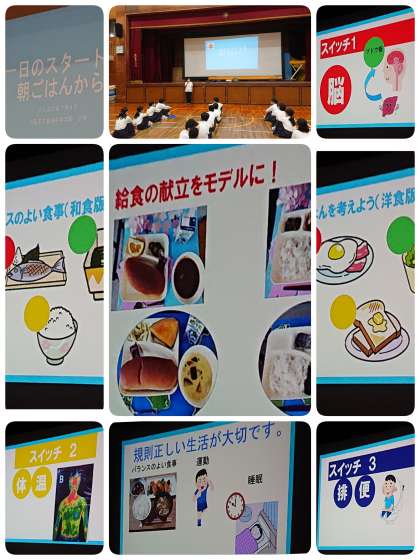 栄養教諭の増田先生から『一日のスタートは朝ごはんから』というお話をしていただきました。朝ごはんはどうして大切なのかを3つのスイッチで考え、バランスのよい朝ごはんに迷ったら給食の献立を参考に。『食事・運動・睡眠』の規則正しい生活が大切だとまとめられていました。