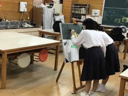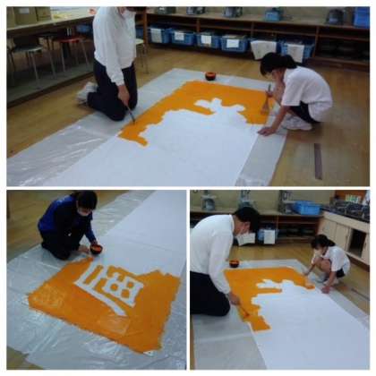 各部員がそれぞれ自分の好きなイラストなどを描いて、楽しく活動しています。夏休みは主に体育大会、文化発表会のテーマの横断幕を作成します。
