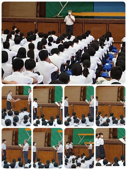 合わせて、表彰伝達も行われました。体操部、陸上競技部、ソフトテニス部の活躍に体育館が暖かい拍手に包まれました。