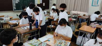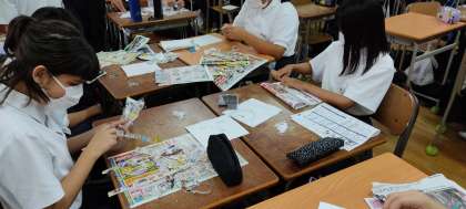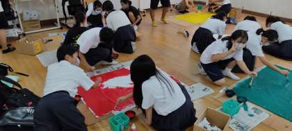 今月末の文化発表会に向けてのちぎり絵と、来月末の体育大会の応援旗作りを同時に行っています。