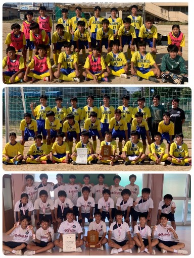 3年生最後の大会となります大阪市秋季総合体育大会が8月27日から行われました。ブロック大会を勝ち上がった32チームでトーナメント戦を行い、10月2日に決勝戦を迎え、梅香中学校相手に60分では2-2の同点で決着がつかず、10分間の延長戦、さらにPK戦へと突入。9人目のキッカーまで延び、9人目の選手のゴールで決着。見事初優勝を飾りました。