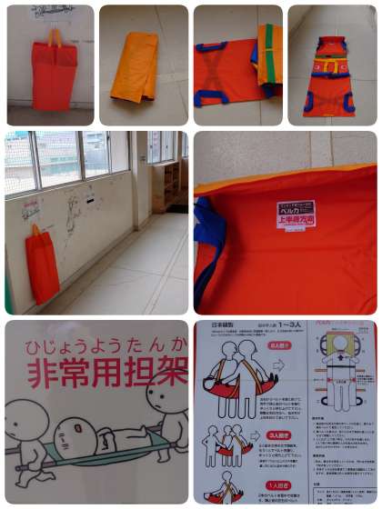 非常用の担架(たんか)を、1年生階段付近の2階、3階、4階の廊下にそれぞれ1台ずつ設置しました。(オレンジ色の袋が目印)