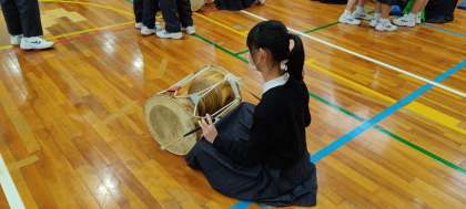 2/13 6時間目に韓国・朝鮮の楽器(ケングァリ、チャンゴ、プク、チン)と遊び(チェギチャギ、ペンイ)の体験をしました。