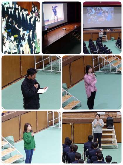 思い出ビデオを視聴して、学年の担当の先生方から卒業生に向けて、最後のメッセージを伝える時間を持ちました。感動的な学年集会となりました。
