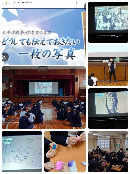 修学旅行のとき鶉野飛行場記念館に訪れます。その事前学習として、『どうしても伝えておきたい一枚の写真』という動画を視聴したあと、各学級で千羽鶴を折りました。