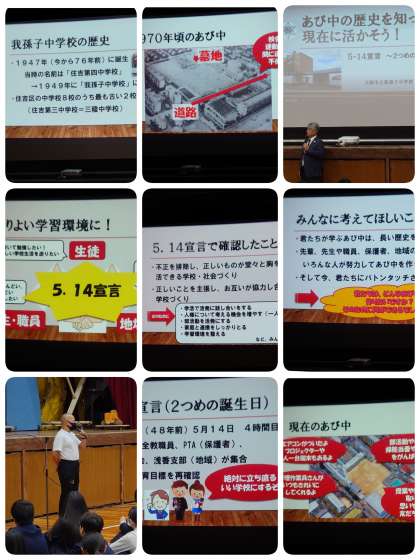 今日は、我孫子中の第2の誕生日である5月14日のこと、5.14宣言の内容を全校生徒で確認し合いました。
