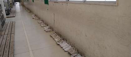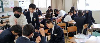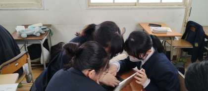 最終日の散策の場所を相談するのに、グループごとに指示された教室に集まってタブレットで、調べています。