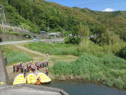 午前中は各班に分かれて体験をします。仁淀川でのラフティングです。説明を受け、これからスタートです。