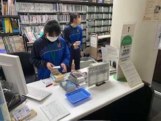 カウンターでの貸し出し業務をしています。学校の図書館と、何が違うかな?