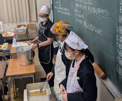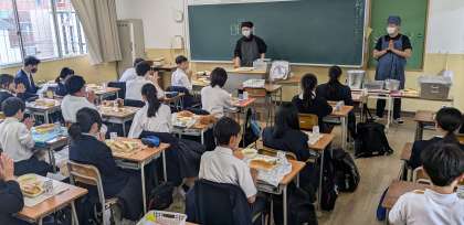 今日も給食。いただきます。2年生と3年生は教室で食べます。