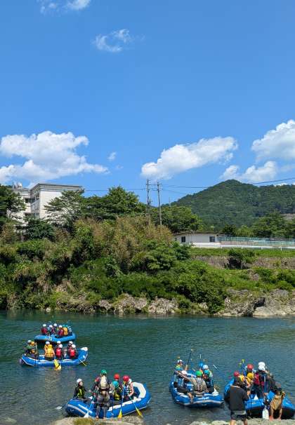 ラフティングの始まりです。とにかく楽しみにしていたという顔ばかり。晴天で暑い今日は水量も適切でラフティング日和だそうです。