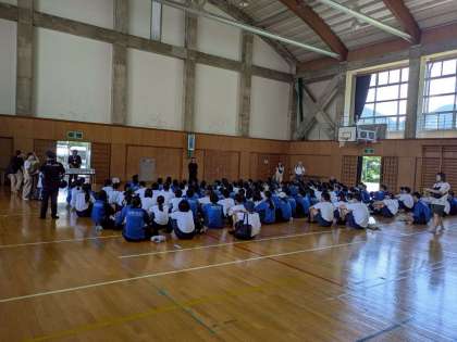 お世話になった西和良小学校。体育館で午後のプログラムの説明を受けています。