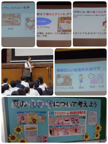 栄養教諭の増田先生より、夏の食生活のお話がありました。バランスの良い食生活、運動、睡眠の基本的な生活習慣が大切であること。とりわけ、熱中症予防には、朝ごはんが重要であること。また、水分補給のことについてもお話がありました。
