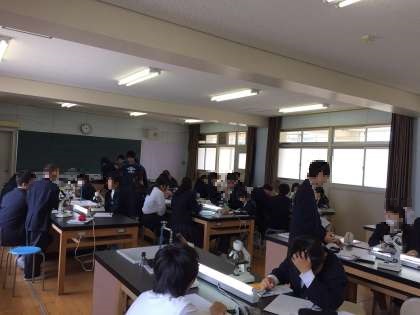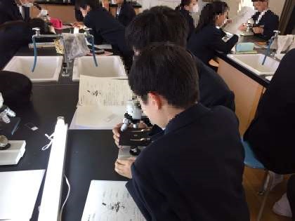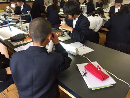 我孫子中学校では4階と2階に理科室が2室あります。今日は4階の理科室で顕微鏡の扱い方についての実験を行いました。