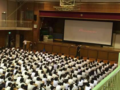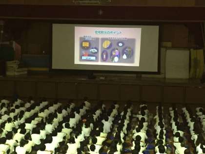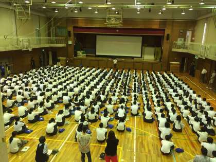 期末テスト最終日の3限目は避難訓練の予定でしたが、あいにくの雨天のため、体育館で火災についての映像教材を視聴し、消防署から来ていただいた消防士さんからお話をいただきました。