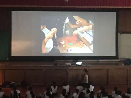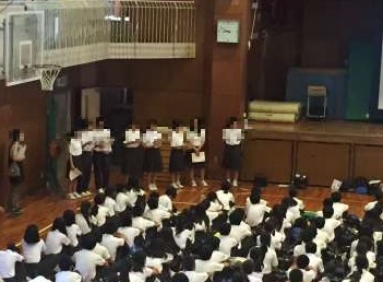 修学旅行委員会の生徒が71期生を代表して、修学旅行で行った平和学習の報告をしました。