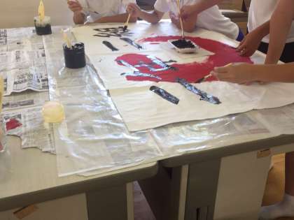 放課後、有志が集まって体育大会に向けて学級旗の制作を行っています。