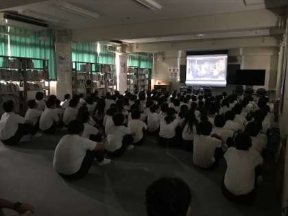 1年生は6時限目、「さとうきび畑の唄」を見ました。このドラマは、太平洋戦争の頃の沖縄と沖縄戦を舞台に、その中で必死に生きたある家族の姿を描いています。今週と来週の2回に分けて見ます。