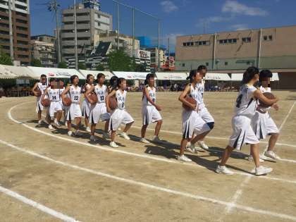 女子バスケットボール部です。一時期は部員数が少なかったのですが、今はたくさんの部員がいます。