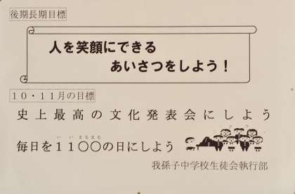 大きな声で相手に対してあいさつをして、みんなで笑顔になろうという意味が込められています。みんなでしっかりあいさつをしましょう!