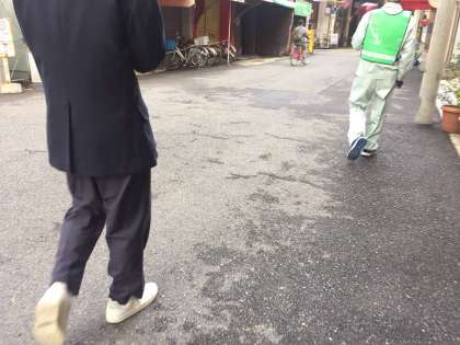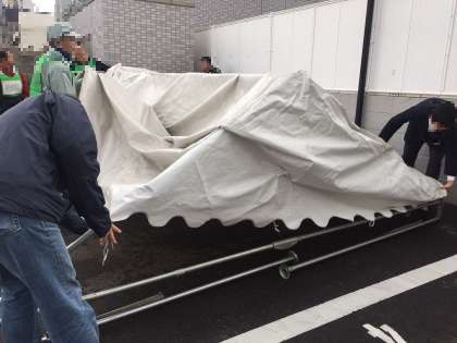 写真は、テントを素早く立てている様子と、町会をまわって、タオルが出ているかどうか見て回りました。