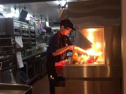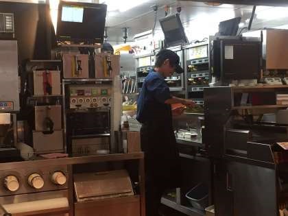それぞれ、ポテト、バーガー、ドリンクを作っていました。制服がとてもよく似合っています。