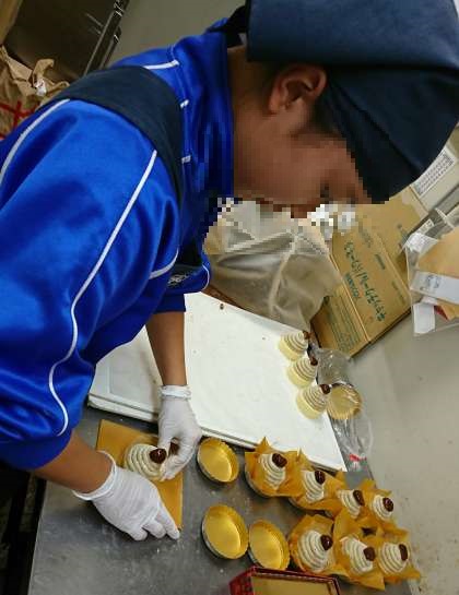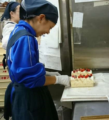 仕上がったケーキに透明のフィルムをつけています。ちょっとした力で形が崩れてしまうので、甘い香りが漂う中で集中しながら作業していました。