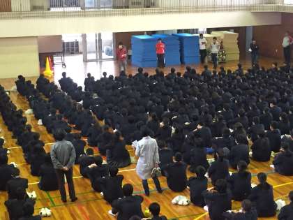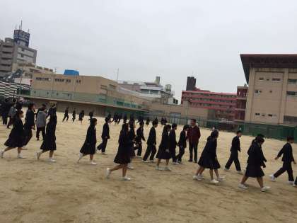 津波発生時のことを想定し、グランドから体育館3階に移動します。体育館3階には、内にある階段、外にある2つの階段を使って、各学年別々に移動しました。災害発生時に混乱しないよう、避難経路を確認しておくことが大事ですね。
