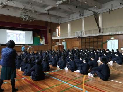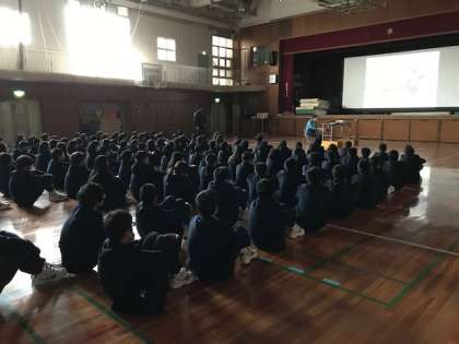 1限目、体育館で、セレッソ大阪U-23、GKコーチ 井出大志様が、?仕事内容?現在の職業に就くまでの過程などについて話してくださいました。